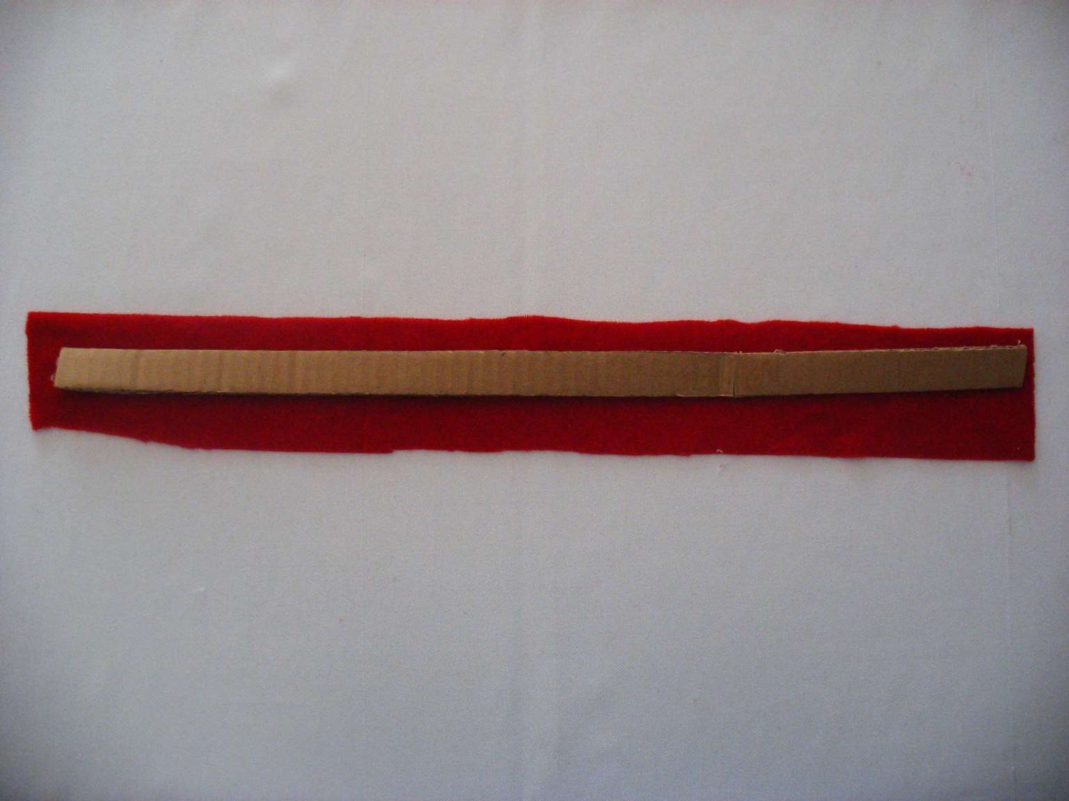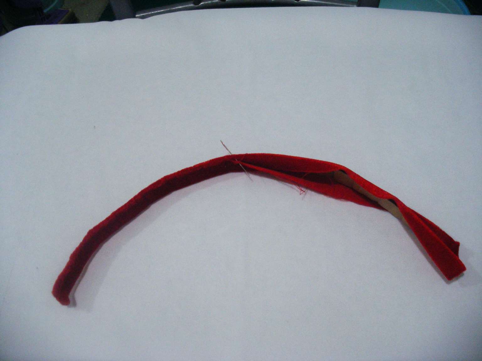 21.用乳胶将小长方形纸板与绒布条固定,并用针线将绒布接合处缝合,如图所示。