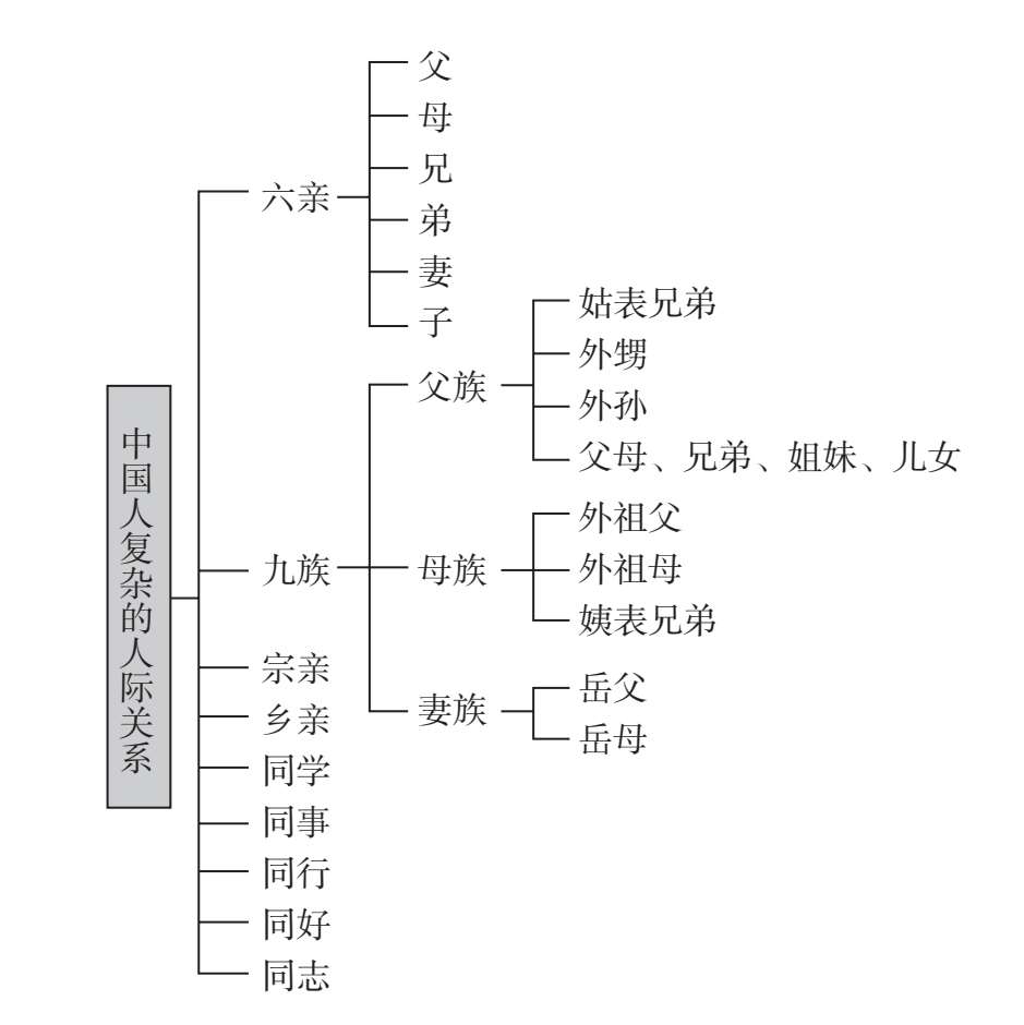 请看我们对亲戚、朋友的称呼,除了六亲、九族、宗亲、乡亲之外,还有同学、同事、同行、同好、同志,几乎稍微一牵连,便可以牵出一大堆关系(见图1–1),而且这些关系还有亲疏之别。不同的关系可能产生不一样的功能,牵来扯去,也可能发生各种不同的变化。可见,人际关系的复杂性,中国堪称举世第一。