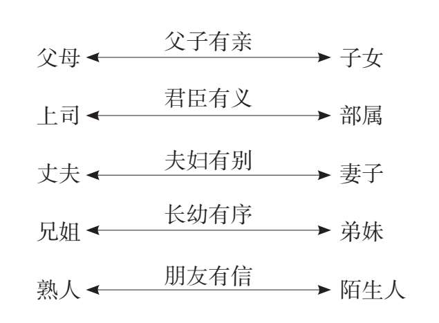 人与人的关系固然十分复杂,但归纳起来,也不外上司与部属、父母与子女、丈夫与妻子、兄姐与弟妹以及熟人与陌生人这五种。《中庸》说:“君臣也,父子也,夫妇也,昆弟也,朋友之交也,五者天下之达道也。”意思是说,君臣、父子、夫妇、兄弟和朋友,是天下人共同具有的五种关系。孟子则将伦理和人际关系结合在一起,提出父子有亲、君臣有义、夫妇有别、长幼有序和朋友有信五种人伦关系(见图2–1)。