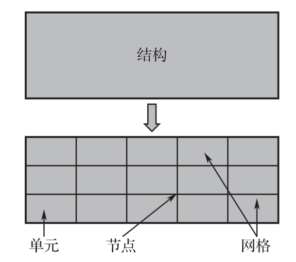 图1-2所示为结构与有限元法。有限元法中的相邻的小区域通过边界上的节点连接起来,可以用一个简单的插值函数来描述每个小区域内的变形和应力。只计算节点处的应力或变形,非节点处的应力或变形是通过函数插值获得的。换句话说,有限元法并不计算区域内任意一点的变形或应力。