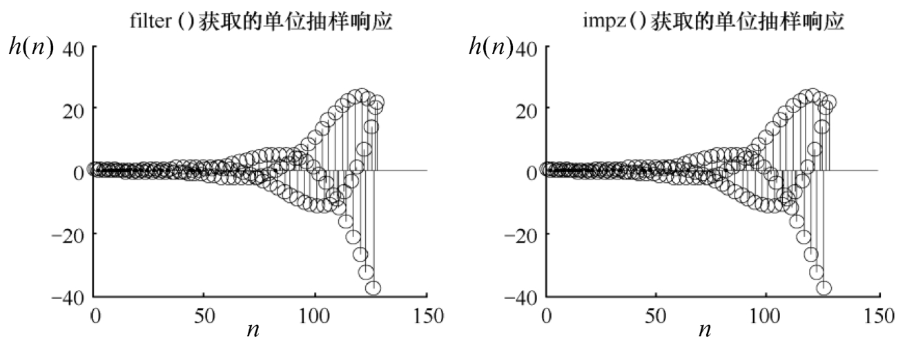 MATLAB提供了一个可以直接求取系统单位抽样响应的函数impz()。impz()函数有两种用法:impz(b,a,p)及h=impz(b,a,p),其中b、a分别为系统函数向量,p为计算的数据点数,如不设置p值,则函数取默认点数进行计算,h为单位抽样响应结果数据。函数的前一种用法直接在MATLAB绘图界面上画出系统的单位抽样响应杆图(Stem),后一种用法则将单位抽样响应结果存入变量 h 中,但不绘图。