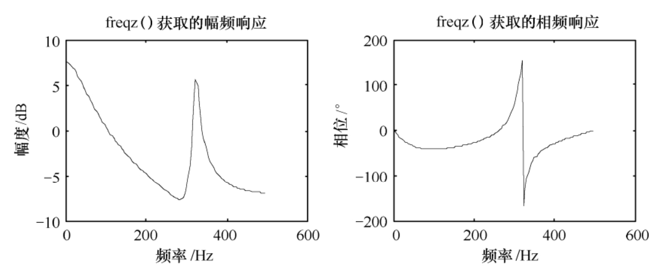 频率响应指系统的幅频(幅度-频率)响应及相频(相位-幅度)响应。频率响应是系统最基本、最重要的特征,用户在设计系统时,通常以达到系统所需的频率响应为目标。对于一个给定的离散系统来说,MATLAB提供了freqz()函数来获取系统的频率响应。与impz()函数类似,freqz()函数也有两种用法:freqz(b,a,n,F s )及[h,f]=freqz(b,a,n,F s ),其中b、a分别为系统函数向量;F s 为抽样频率;n为在[0,F s /2]范围内计算的频率点数量,并将频率值存放在f中;h存放频率响应计算结果。函数的第一种用法可直接绘出系统的幅频响应及相频响应曲线,第二种用法将频率响应结果存放在h及f变量中,但不绘图。