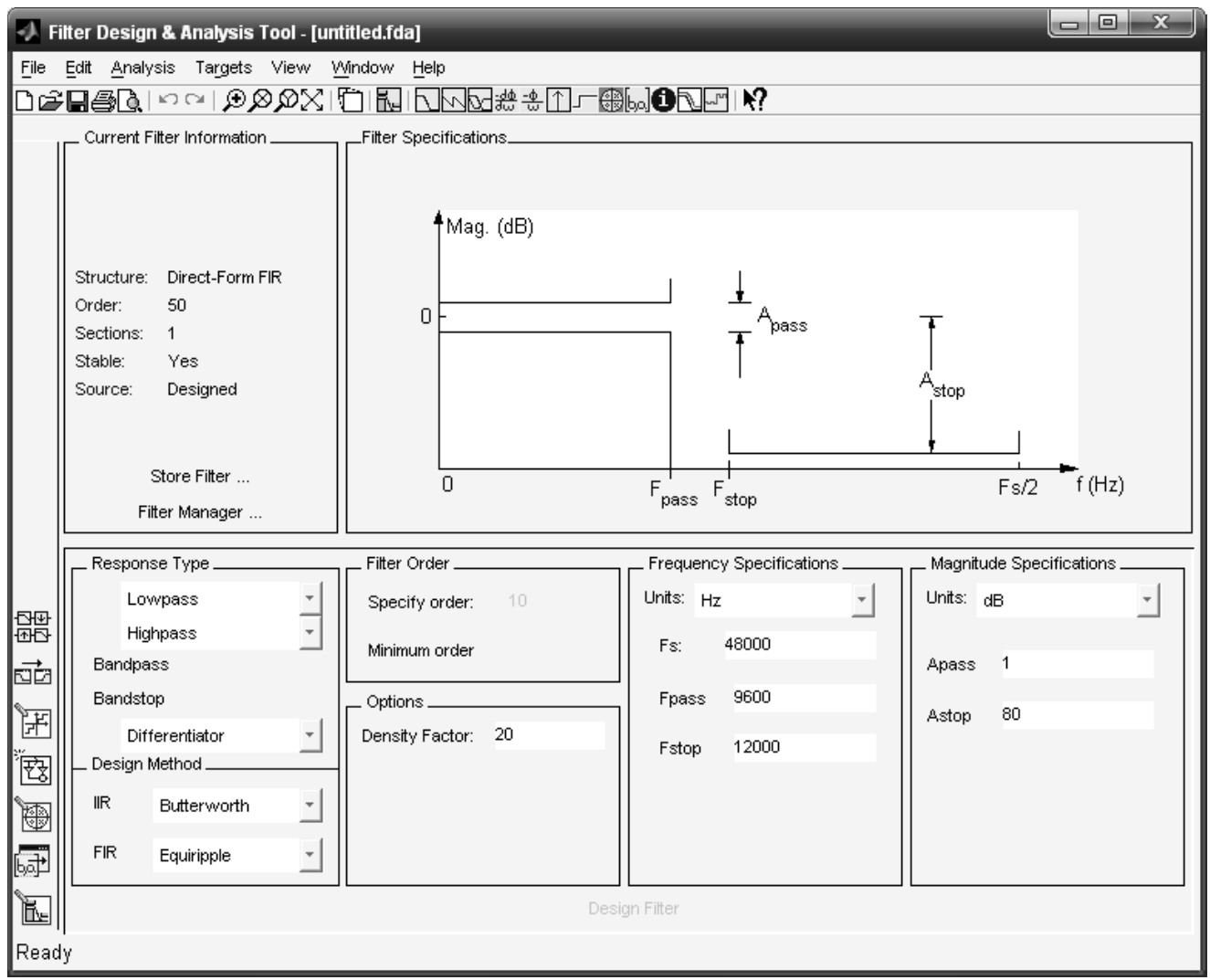 FDATOOL的工作界面如图2-13所示,总共分两大部分:一部分是Design Filter,在界面的下半部分,用来设置滤波器的设计参数;另一部分是特性区,在界面的上半部分,用来显示滤波器的各种特性。