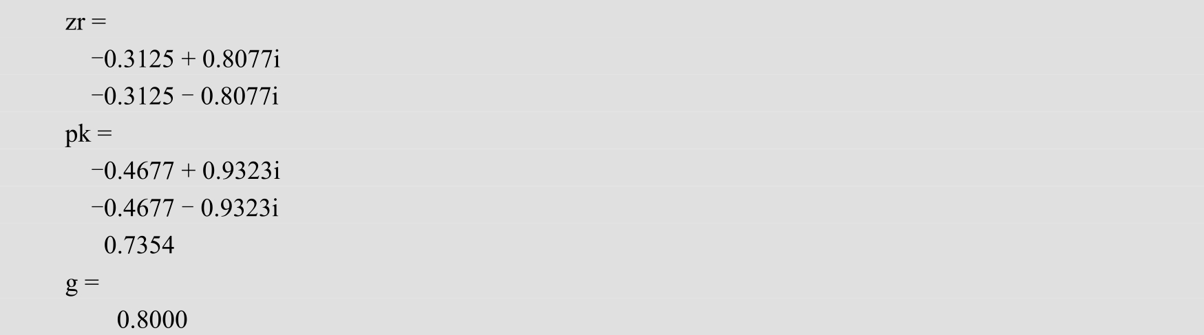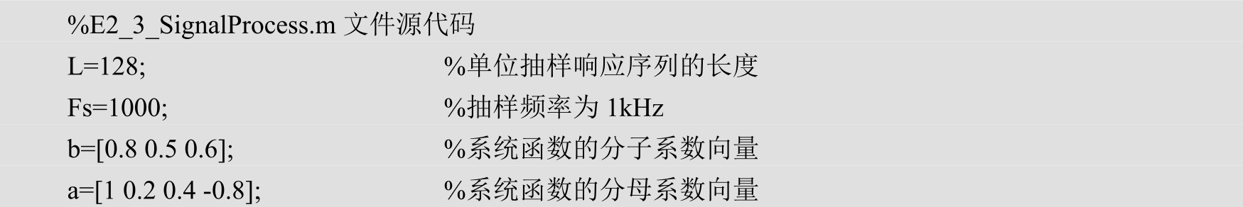 将式(2-1)的分子项系数依次从小到大排列成一个行矩阵(向量) b ,分母项依次从小到大排列成一个行矩阵 a (其中 a 0 =1),则依据 b 、 a 可唯一确定离散系统。