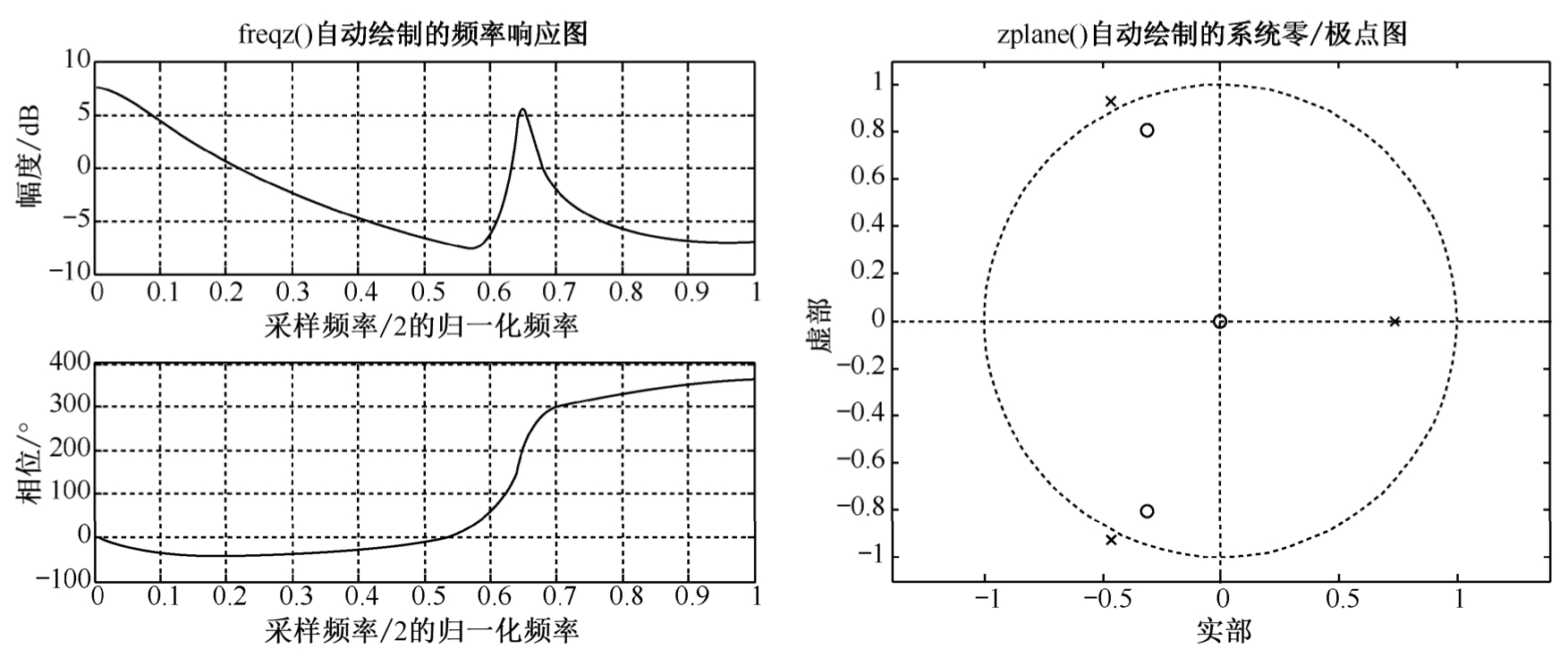 图2-11 freqz()及zplane()自动绘制的频率响应及零/极点图