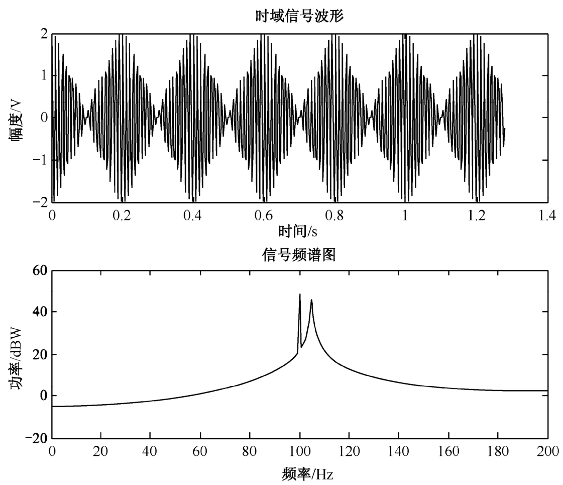 程序运行结果如图2-12所示,从图中可以看出,在时域上难以分辨的叠加的两个正弦波信号,在频域上可以很容易地分辨出来。