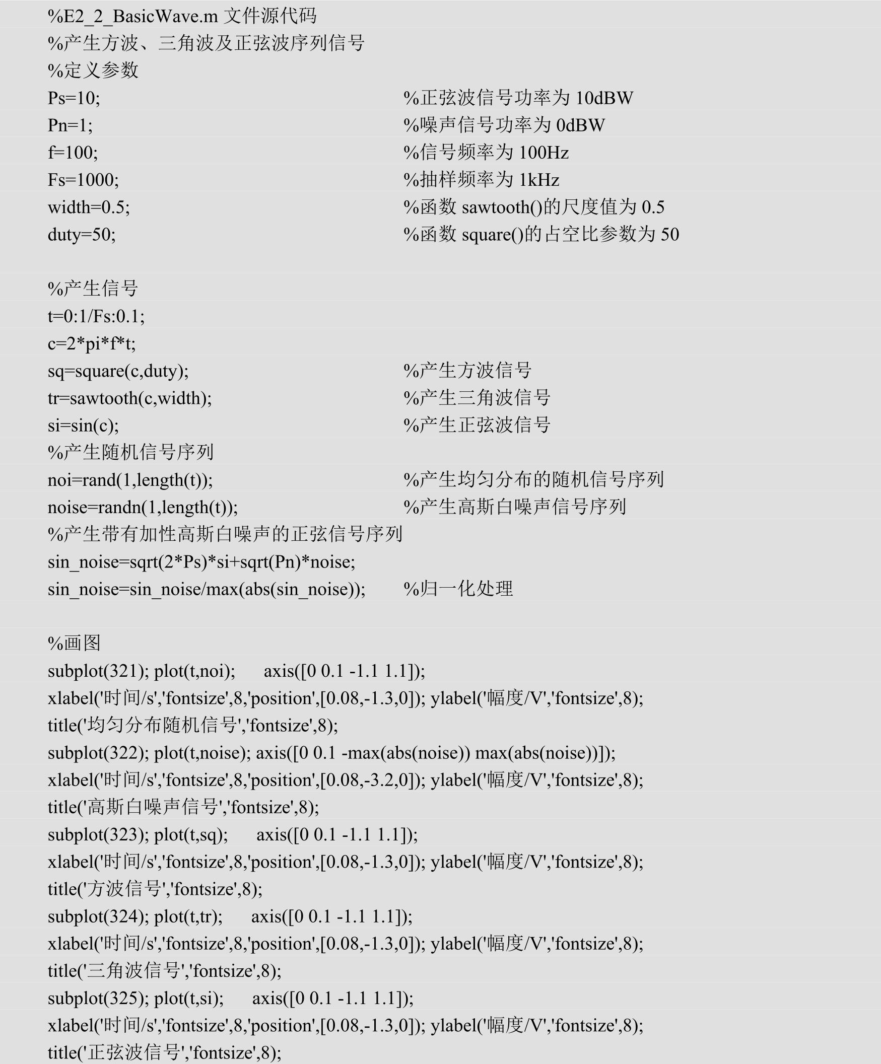 例2-2:MATLAB常用信号产生函数演示实例。