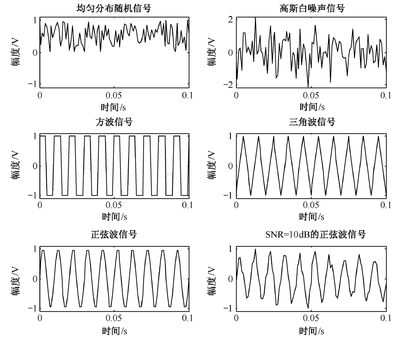 编写一个m文件,依次产生均匀分布随机信号序列、高斯白噪声信号序列、方波信号序列、三角波信号序列、正弦波信号序列,以及SNR=10dB的正弦波信号序列,程序源代码如下。