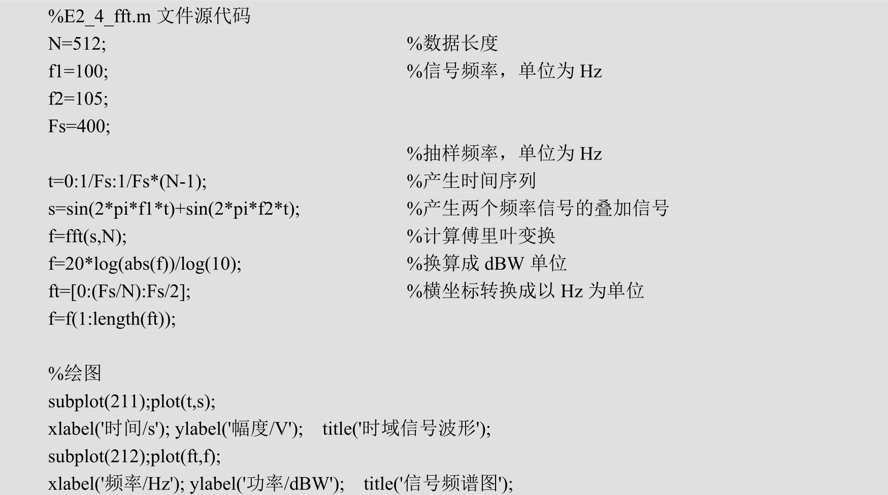 编写一个M文件,产生频率为100Hz和105Hz正弦波信号叠加后的信号,用fft()函数对信号进行频率分析,要求在频率上能分辨出两种频率的正弦波信号,分别绘出信号的时域及频域波形。实例源代码文件名为E2_4_fft.m,程序源代码如下。