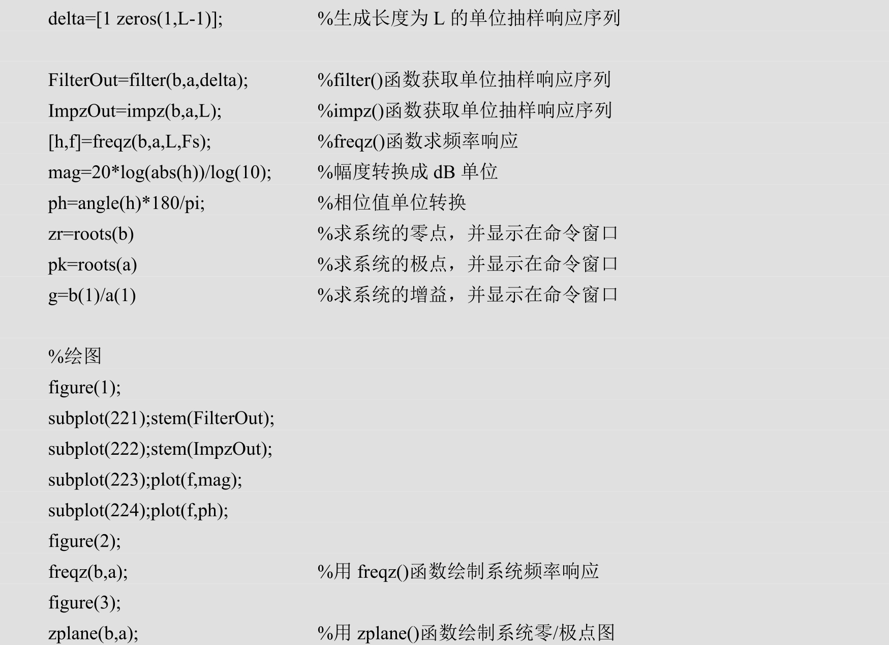 对于一个离散系统来说,系统的零/极点及增益函数可以明确地反映系统的因果性、稳定性等重要特性,进行系统分析及设计时也常常会计算其零/极点及增益函数。用户可以使用MATLAB提供的root()函数来计算系统的零/极点,也可以直接使用zplane()函数来画出系统的零/极点图。