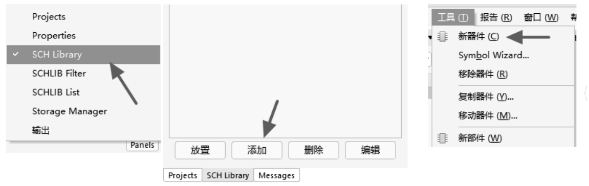 在元件库编辑器界面的右下角执行命令“Panels-SCH Library”,调出元件库面板(也称“SCH Library”面板),单击元件栏中的“添加”按钮,添加一个元件,如图4-8中左图所示;或者执行菜单命令“工具-新器件”,新建一个元件,如图4-8中右图所示。