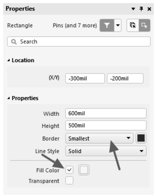 放置完毕后,可以选中矩形框对边框的大小进行调整。双击矩形框,可以对其属性进行设置,如图4-11所示,建议勾选“Fill Color”(对矩形框进行填充),“Border”(边界线宽)选择“Smallest”。