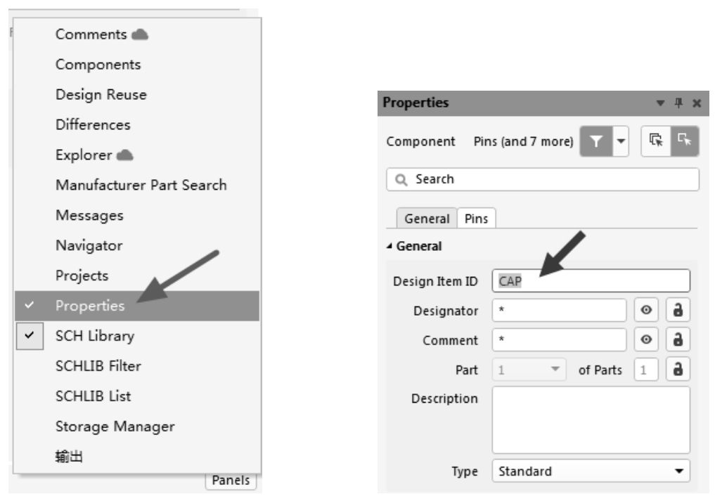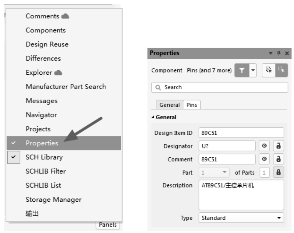 在元件库面板列表中选中这个元件,然后在界面的右下角执行命令“Panels-Properties”,打开元件“Properties”面板,或者在元件库面板中双击该元件名称也可以打开该面板。