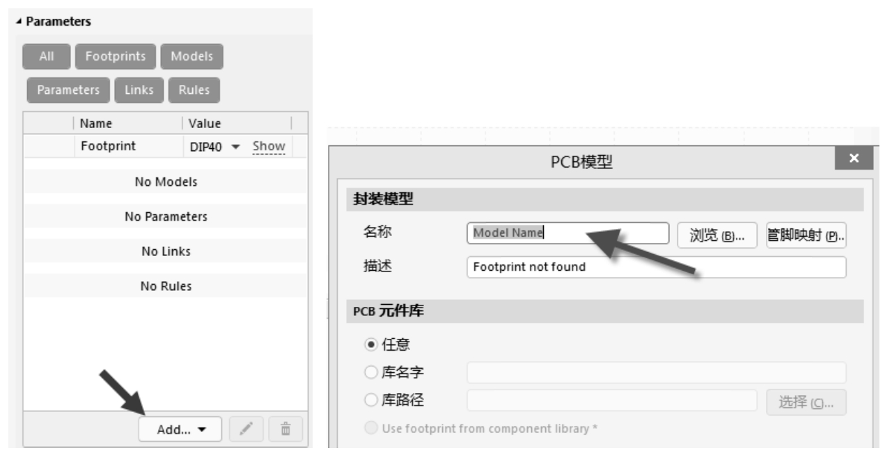 (2)封装模型:如图4-15所示,单击“Add”按钮,可以选择添加PCB封装模型,同时也可以对已存在的PCB封装模型进行移除或者编辑操作。