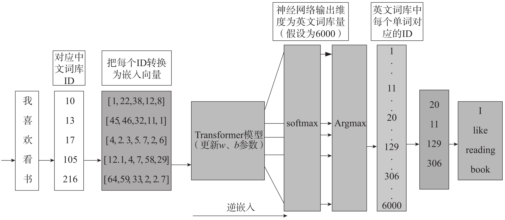 图1-12 利用Transformer模型进行中文翻译成英文的流程