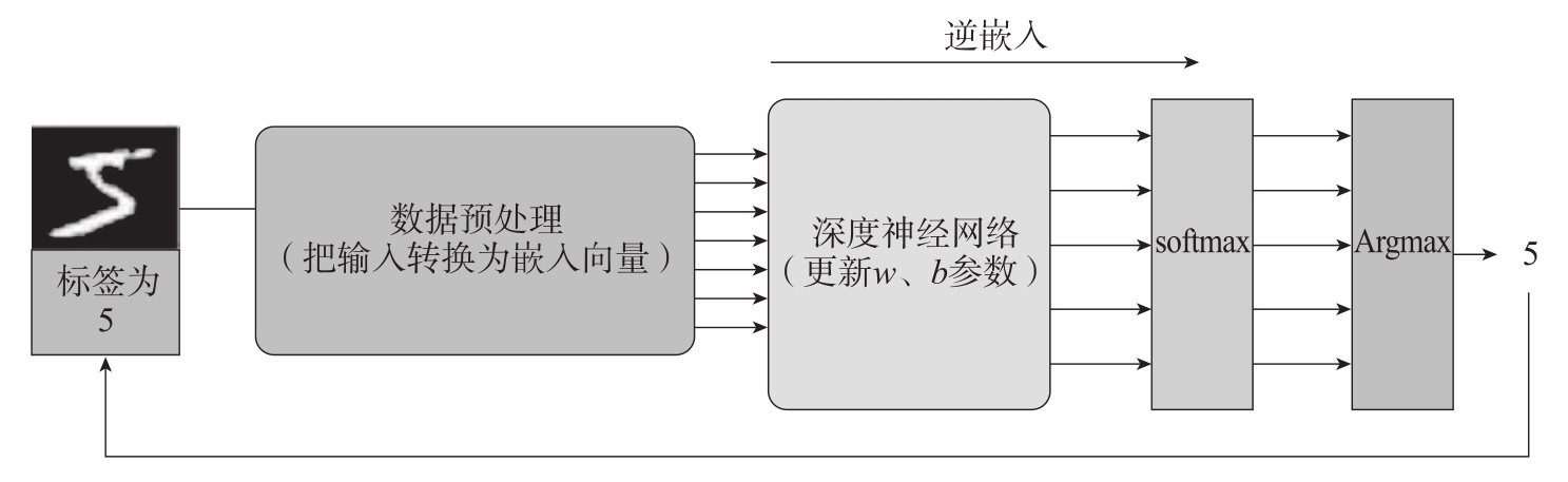表示学习的逆嵌入(De-Embedding)是指将嵌入向量转化回原始离散数据的过程。在深度学习中,可以使用逆映射函数来实现表示学习的逆过程。逆映射函数通常是一个神经网络模型,将嵌入向量作为输入,输出对应的原始离散数据,如图1-11所示。