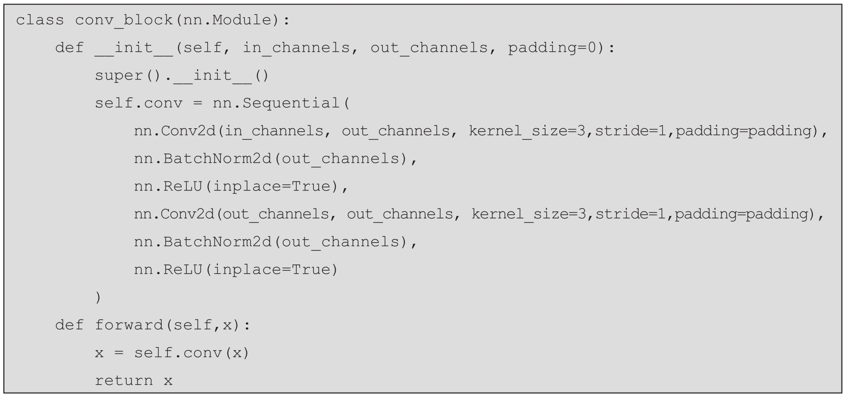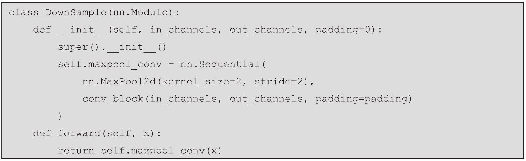 2)定义下采样模块,这里的下采样包括最大池化下采样和连续的两个“卷积(3×3)+ReLU激活函数”。