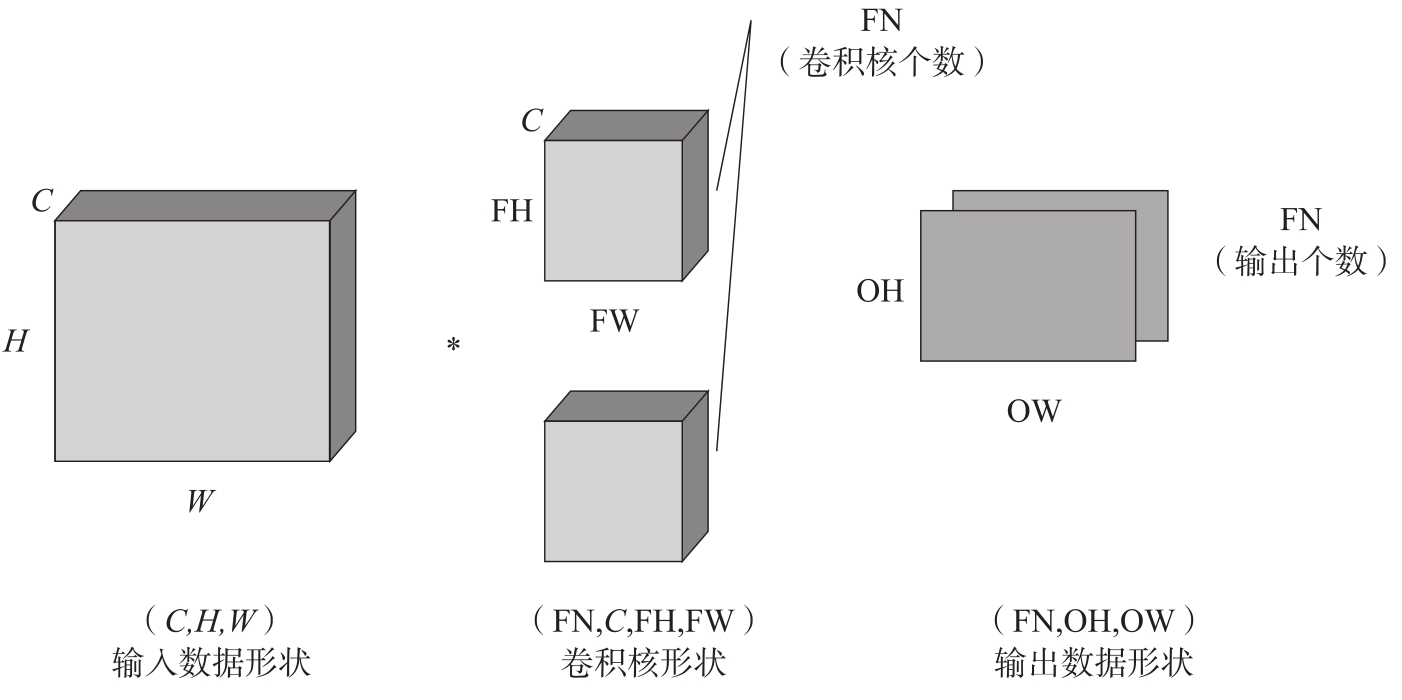 为了实现更多边缘检测,可以增加更多卷积核组。图2-21就是两组卷积核:卷积核1和卷积核2。这里的输入为3×7×7,经过与两个3×3×3的卷积核(步幅为2)的卷积运算,得到的输出为2×3×3。另外,我们也会看到图2-21中的补零填充(Zero Padding)是1,也就是在输入元素的周围补0。补零填充对于图像边缘部分的特征提取是很有帮助的,可以防止信息丢失。最后,不同卷积核组卷积得到不同的输出,个数由卷积核组决定。