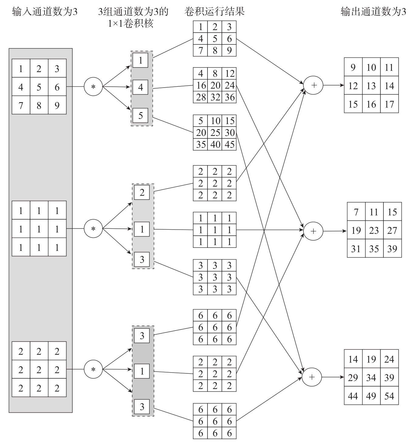 使用1×1卷积核可以增加或减少通道数,也可以组合来自不同通道的信息。图2-23为通过1×1卷积核改变通道数的例子。