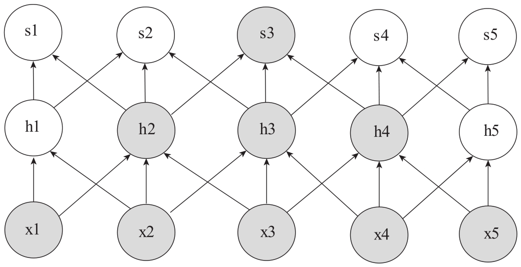 由图2-28可以看出,经过几个卷积层之后,特征图逐渐变小,一个特征所表示的信息量越来越多,如s3表示了x1、x2、x3、x4、x5的信息。