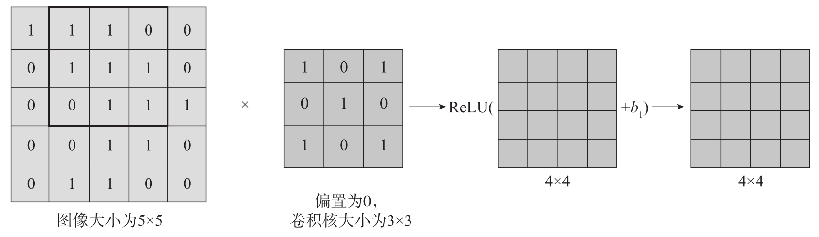 如何对输入数据进行卷积运算?回答这个问题之前,我们先回顾一下图2-9。在图2-9a中,左上方的小窗口实际上就是卷积核,其中×后面的值就是卷积核的值。如第1行×1、×0、×1对应卷积核的第1行[1 0 1]。图2-9c的第1行第1列的4是如何得到的呢?就是由5×5矩阵中由前3行、前3列构成的矩阵各元素乘以卷积核中对应位置的值,然后累加得到的,即1×1+1×0+1×1+0×0+1×1+1×0+0×1+0×0+1×1=4。那么,如何得到图2-9c中第1行第2列的值呢?我们只要把图2-9a中小窗口往右移动一格,然后进行卷积运算即可。以此类推,最终得到完整的特征图的值,如图2-16所示。