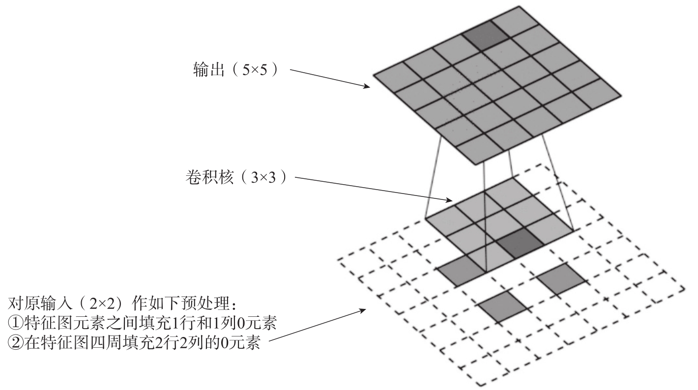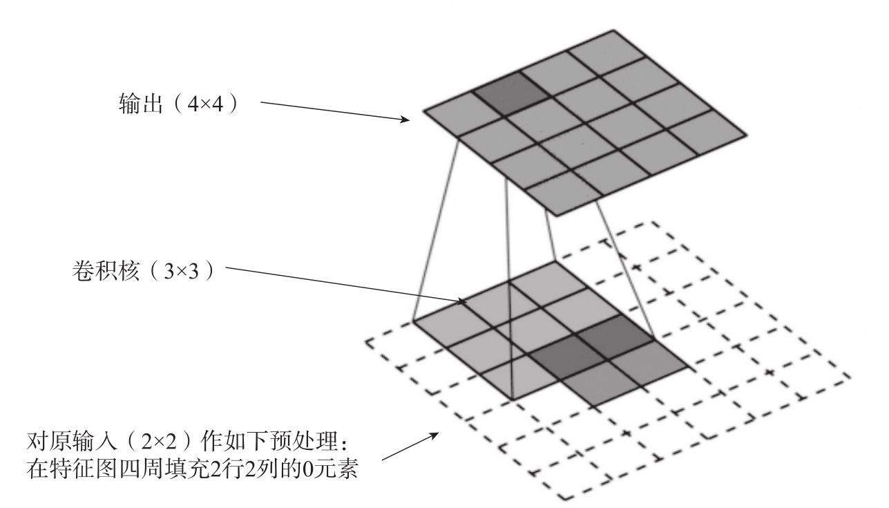 图2-25的参数为 s =1、 p =0、 k =3,原输入大小为 i =2,由此可得转置卷积的输出大小为:
