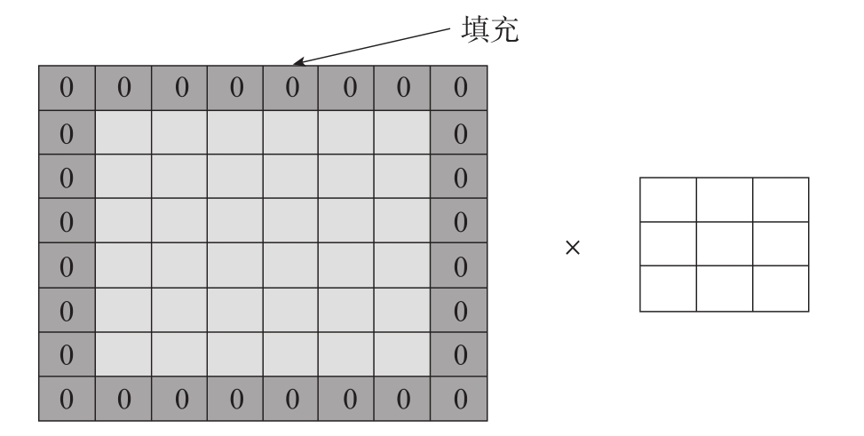 当输入图像与卷积核不匹配或卷积核超过图像边界时,可以采用边界填充的方法,即把图像尺寸进行扩展,扩展区域补0,如图2-19所示。当然也可以不扩展。