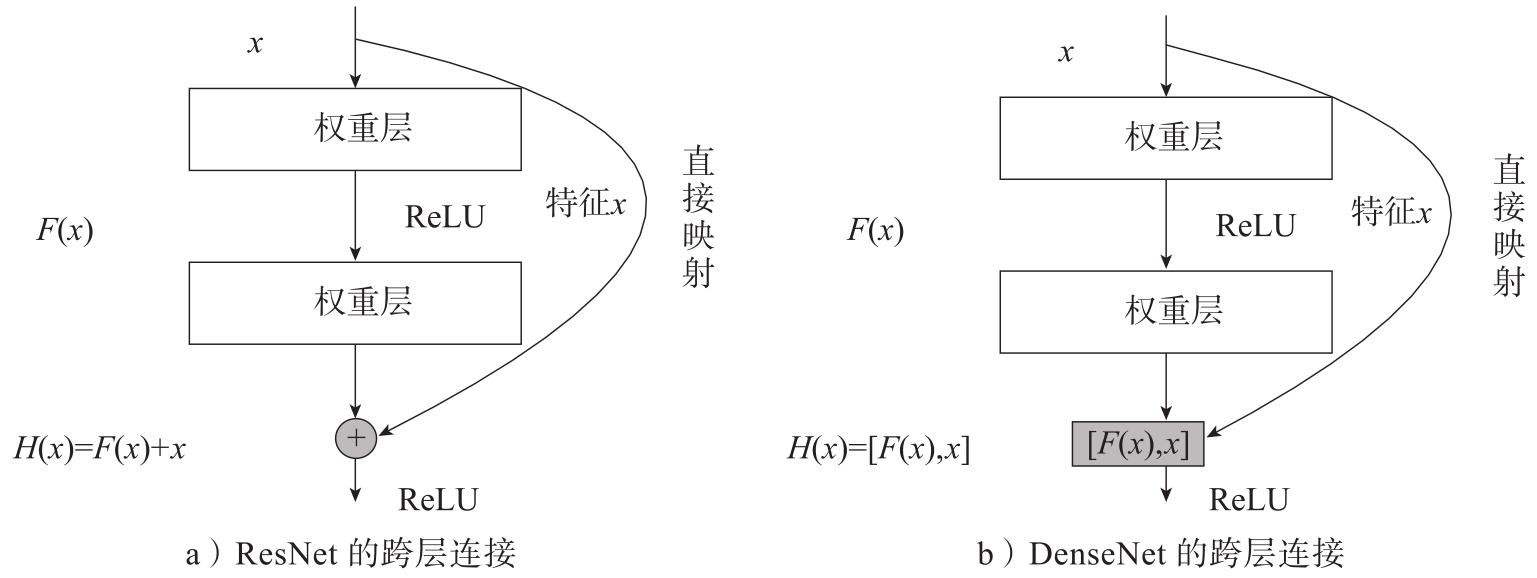 由图2-32可知,ResNet和DenseNet的主要区别在于,DenseNet的输出是连接(如图2-32b中的[,]表示),而不是ResNet的简单相加。