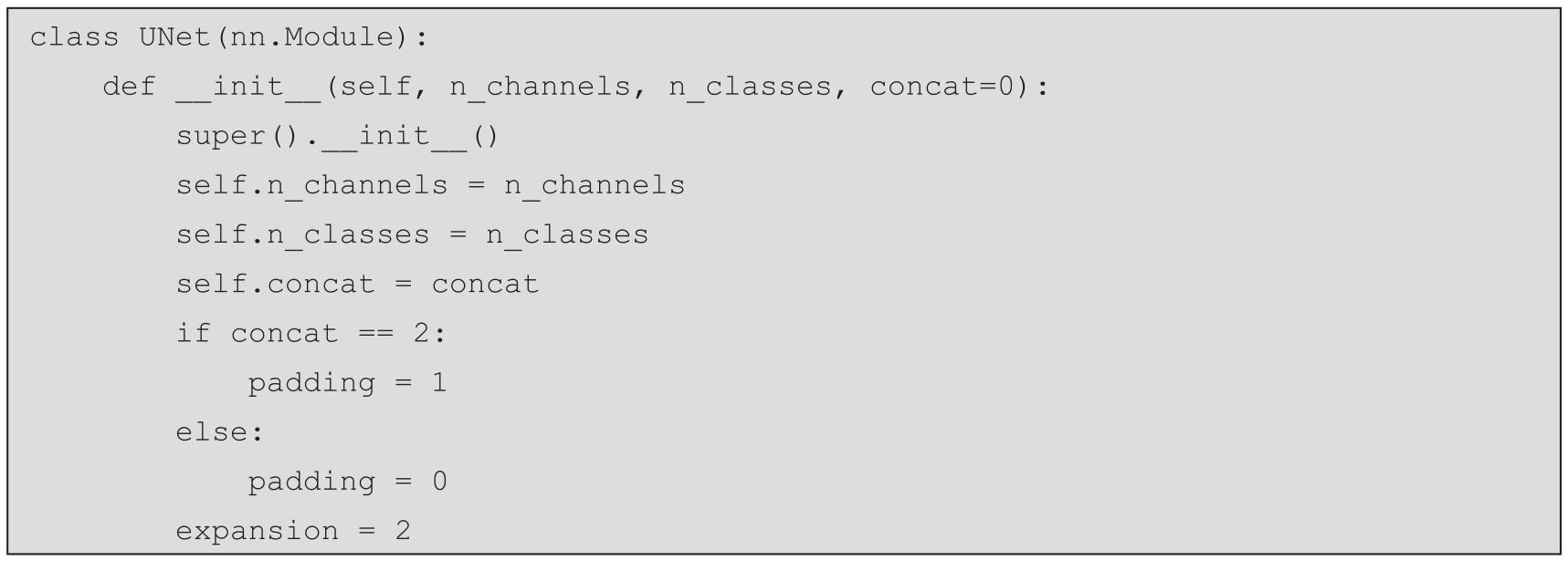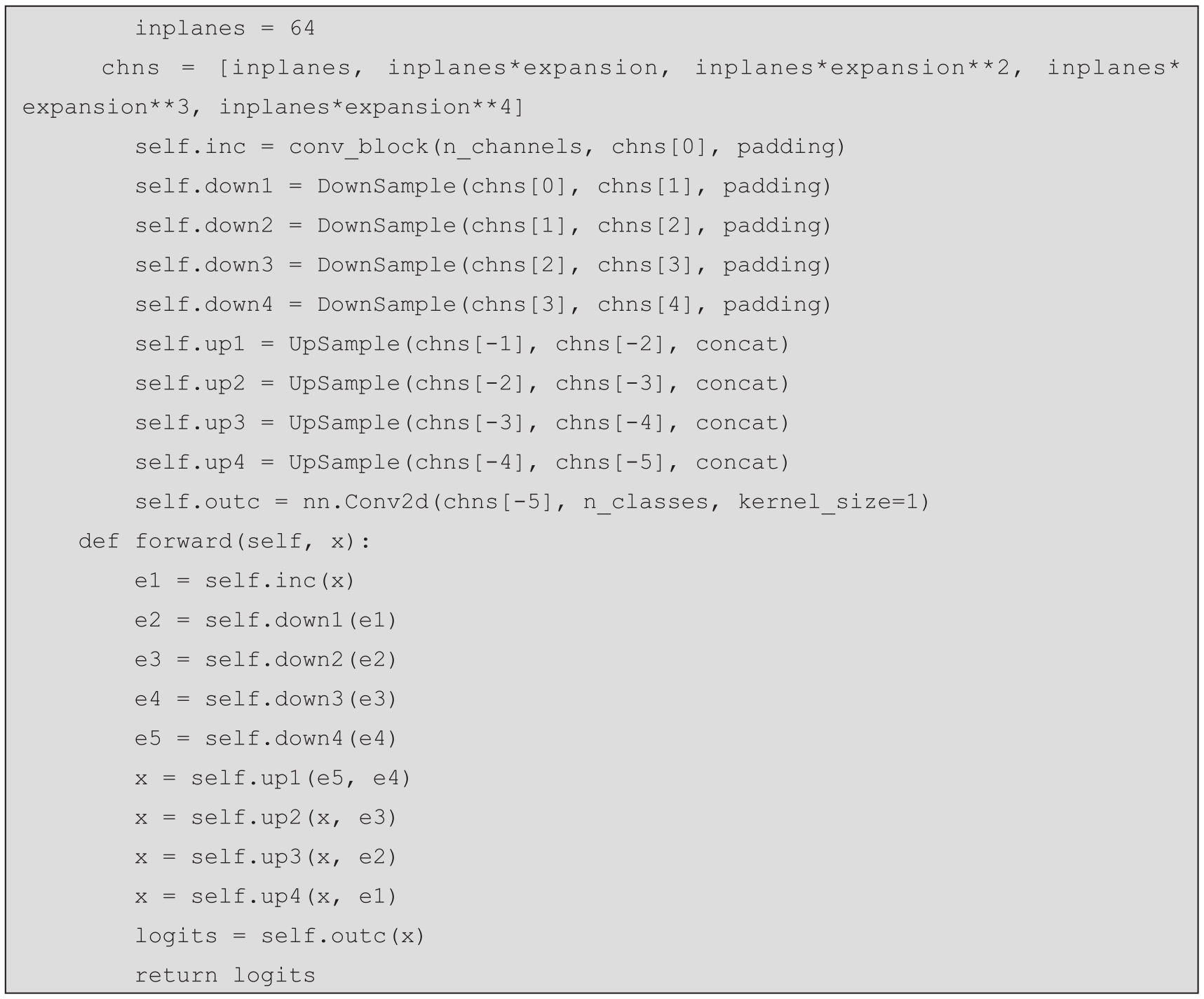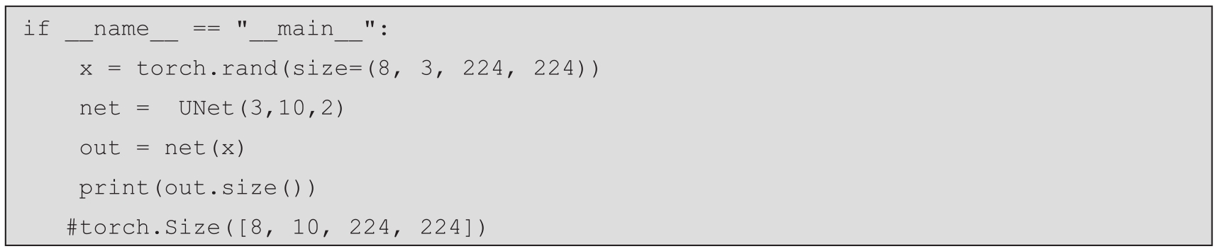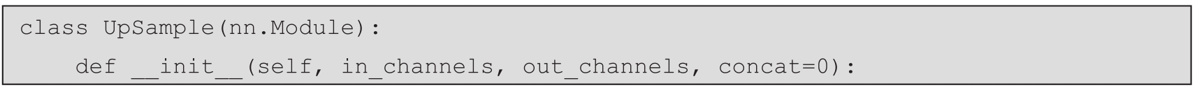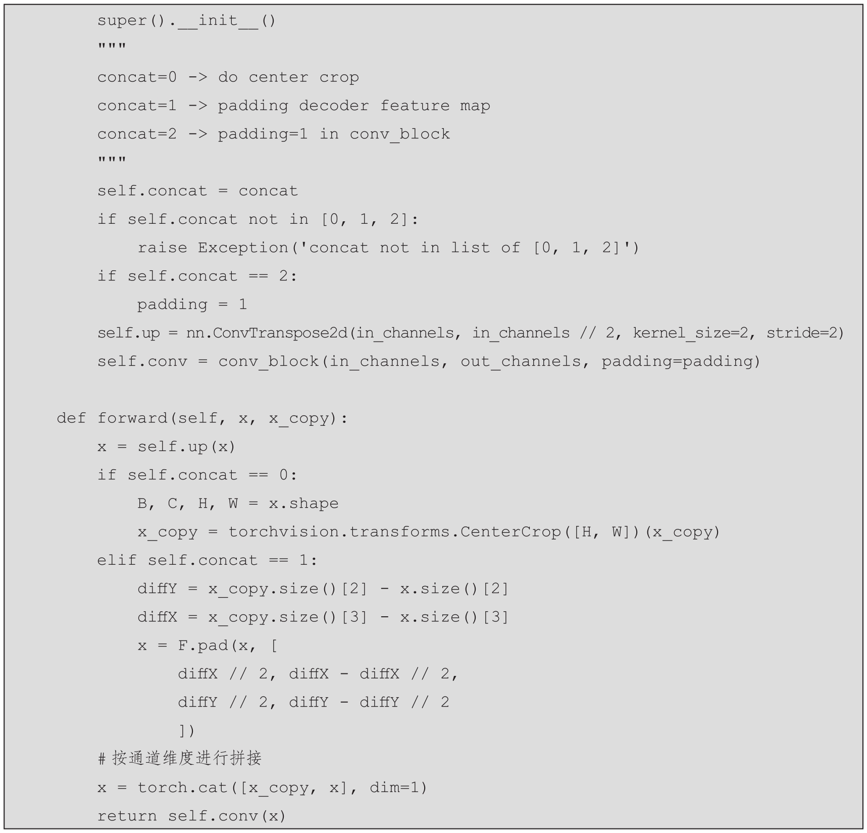 3)定义上采样模块,这里的上采样包括转置卷积上采样,并与左侧对应编码器的特征图拼接(concatenation),之后进行连续的两个“卷积(3×3)+ReLU激活函数”。