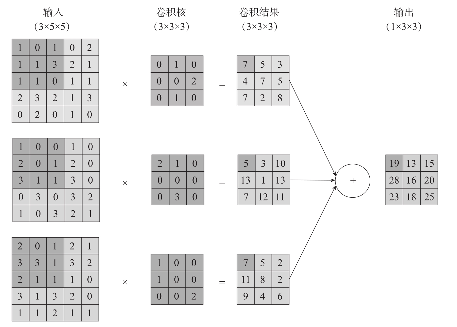 3通道图像的卷积运算与单通道图像的卷积运算基本一致,对于3通道的RGB图像,其对应的卷积核算子同样也是3通道的。例如一个图像是3×5×5的,3个维度分别表示通道数(channel)、图像的高度(height)、宽度(weight)。卷积过程是将每个单通道(R,G,B)与对应的卷积核进行卷积运算,然后将3通道的和相加,得到输出图像的一个像素值。具体过程如图2-20所示。