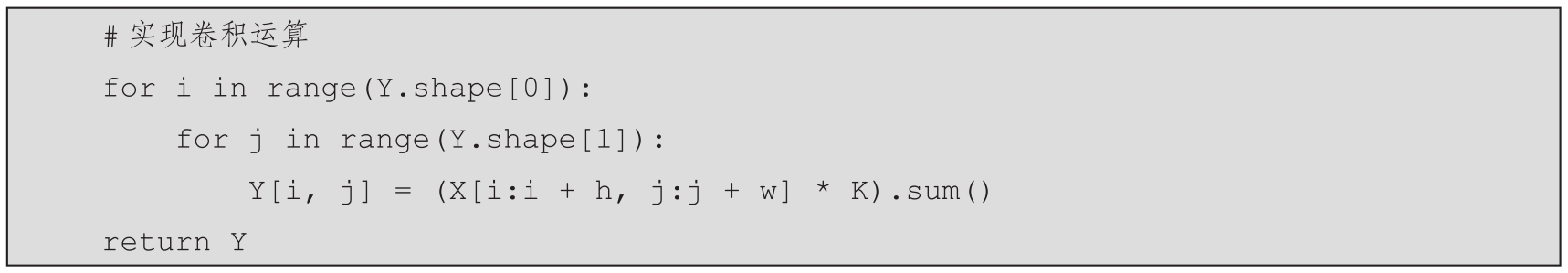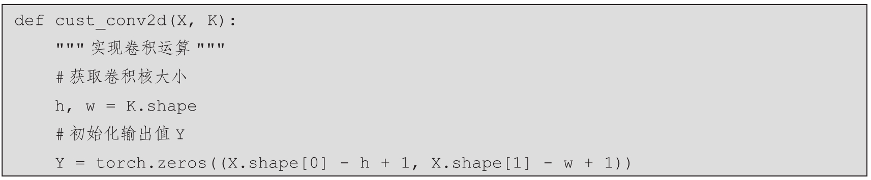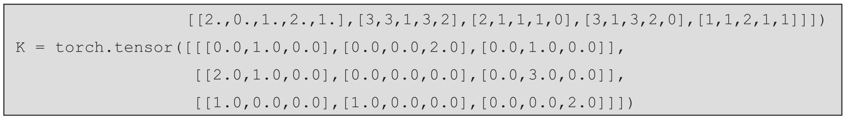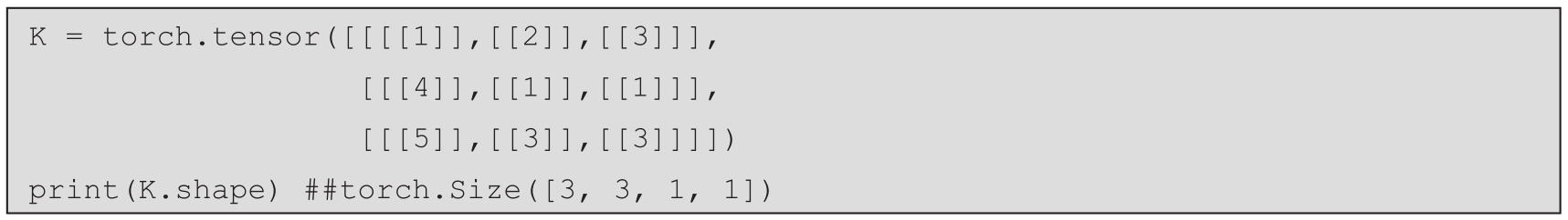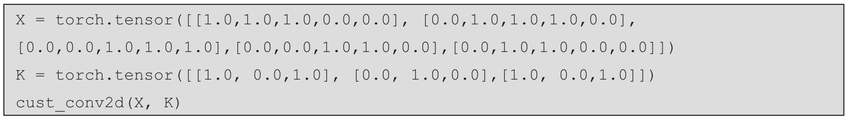 用卷积核中每个元素乘以对应输入矩阵中的对应元素,原理还是一样,但输入张量为5×5矩阵,而卷积核为3×3矩阵,得到一个3×3矩阵。这里首先就要解决如何对应的问题。把卷积核作为输入矩阵上的一个移动窗口,通过移动与所有元素对应,对应问题就迎刃而解了。这个卷积运算过程可以用PyTorch代码实现。