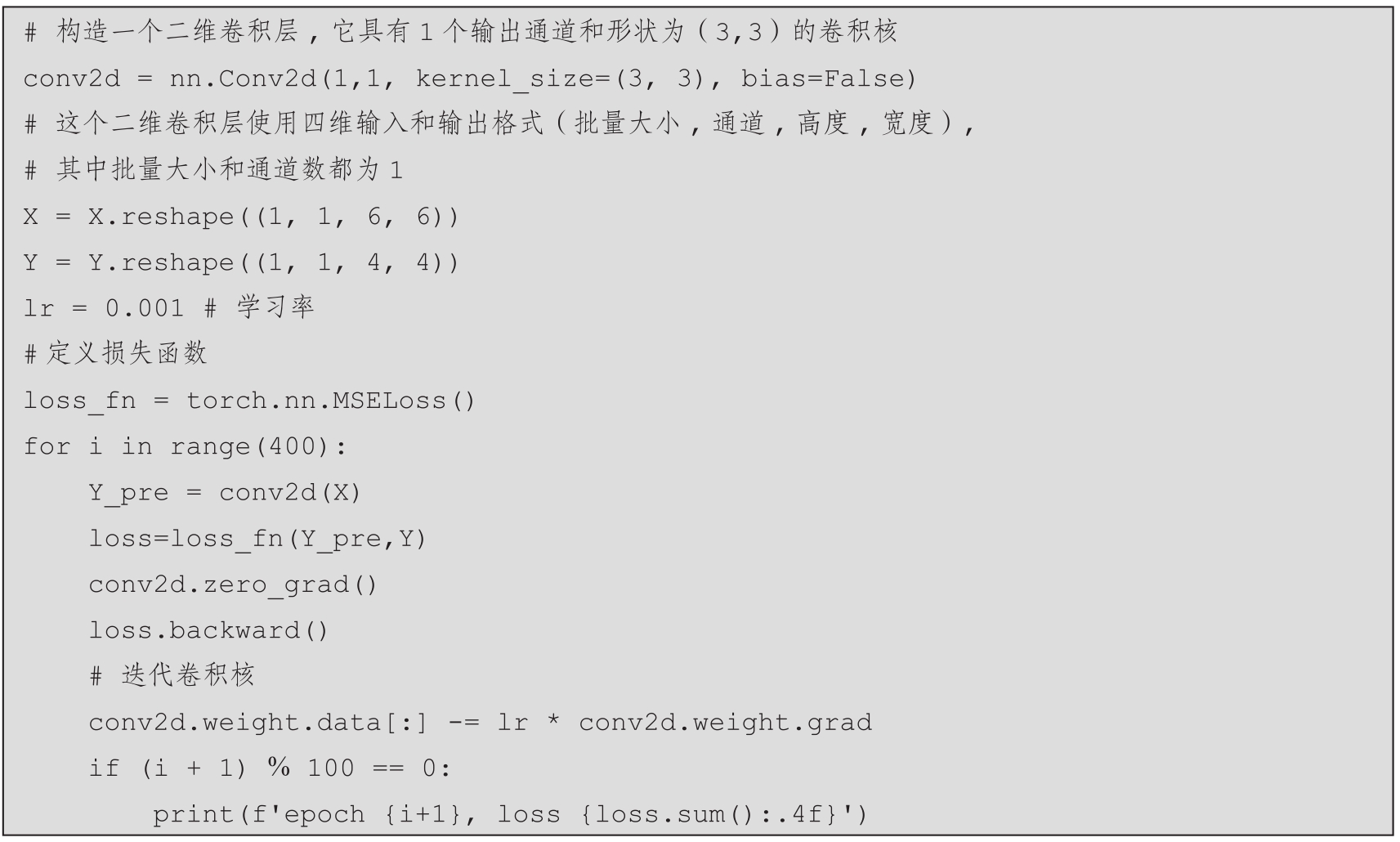 以图2-14为例,给定输入 X 及输出 Y ,根据卷积运算,通过多次迭代可以得到卷积核的近似值。