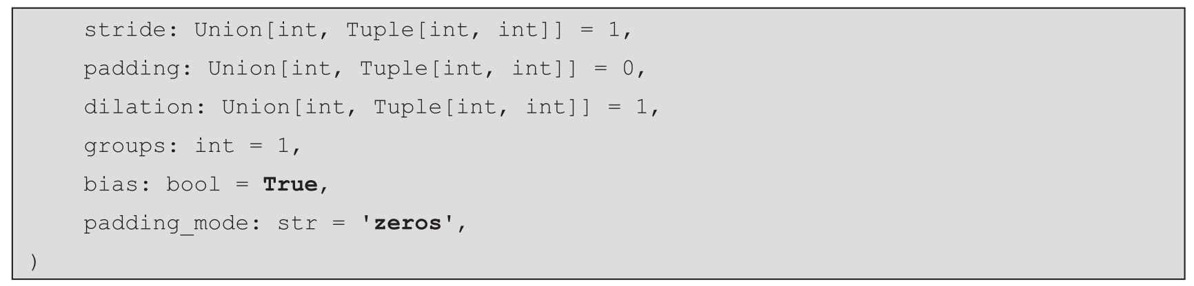 ● bias(bool, optional):如果bias=True,则添加偏置。其中参数kernel_size、stride、padding、dilation可以是一个整型(int)数值,此时卷积的height和width值相同,也可以是一个tuple数组,tuple的第一维度表示height的数值,tuple的第二维度表示width的数值。