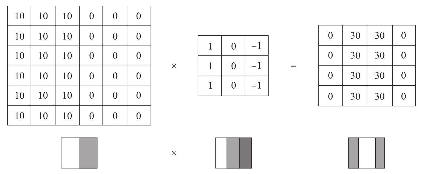 这个卷积核是3×3矩阵(卷积核一般是奇数阶矩阵),其特点是第1列和第3列有数值,第2列为0。经过这个卷积核的作用后,就把原数据垂直边缘检测出来了。