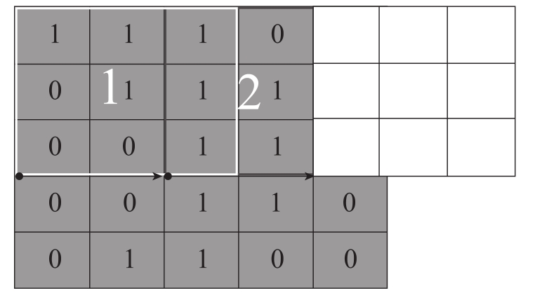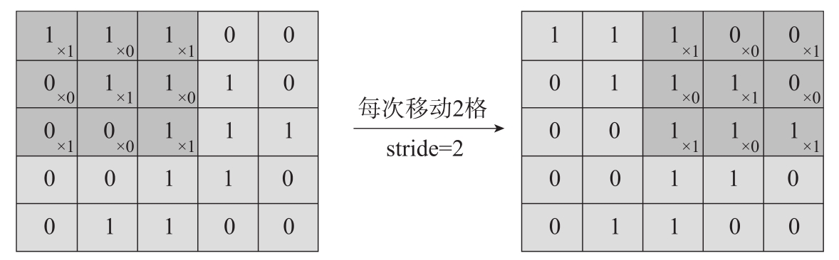 小窗口(实际上就是卷积核)在图2-9a中每次移动的格数(无论是自左向右移动,还是自上向下移动)称为步幅(stride),在图像中就是跳过的像素个数。在上面的示例中,小窗口每次只移动一格,故参数stride=1,这个参数也可以是2或3等其他数值。如果是2,则每次移动时就跳2格或2个像素,如图2-17所示。
