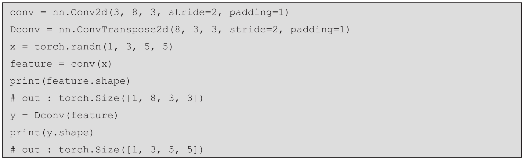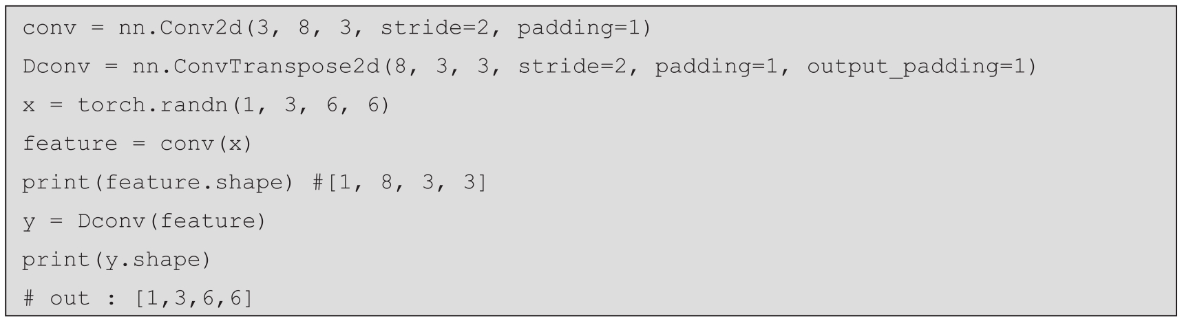 情况2:将输入x先进行卷积运算,然后再使用转置卷积,使最后的输出形状与输入形状一致。这里用到了参数output_padding,这个参数主要用于调整输出分辨率。