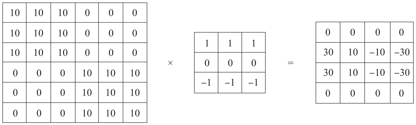 图2-9c中的4是图2-9a左上角的3×3矩阵与卷积核矩阵的对应元素相乘后的汇总结果,如图2-10所示。