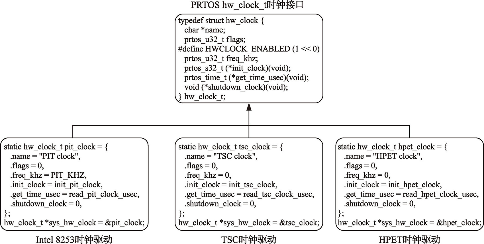 PRTOS使用数据结构hw_clock_t来管理硬件时钟,具体实现请参考源码core/include/ktimer.h。硬件时钟是全局时钟,不管是单处理器硬件平台,还是SMP硬件平台,都只使用一个全局硬件时钟。针对Intel X86 硬件平台的3种不同的时钟硬件,PRTOS提供了3种时钟驱动,分别是Intel 8253时钟驱动、TSC时钟驱动、HPET(High Precision Event Timer,高精度事件时钟)时钟驱动,如图3-2所示。