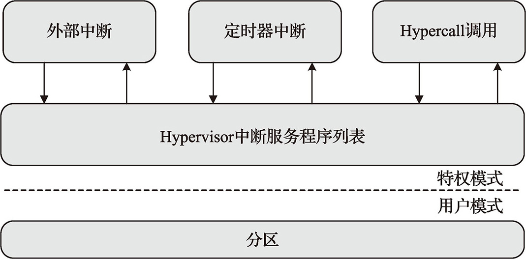 分区通过Hypervisor提供的超级调用服务来使用虚拟化的资源。比如分区需要设置定时器时,不能直接访问硬件定时器资源,可以通过使用Hypervisor提供的定时器服务来实现定时功能。