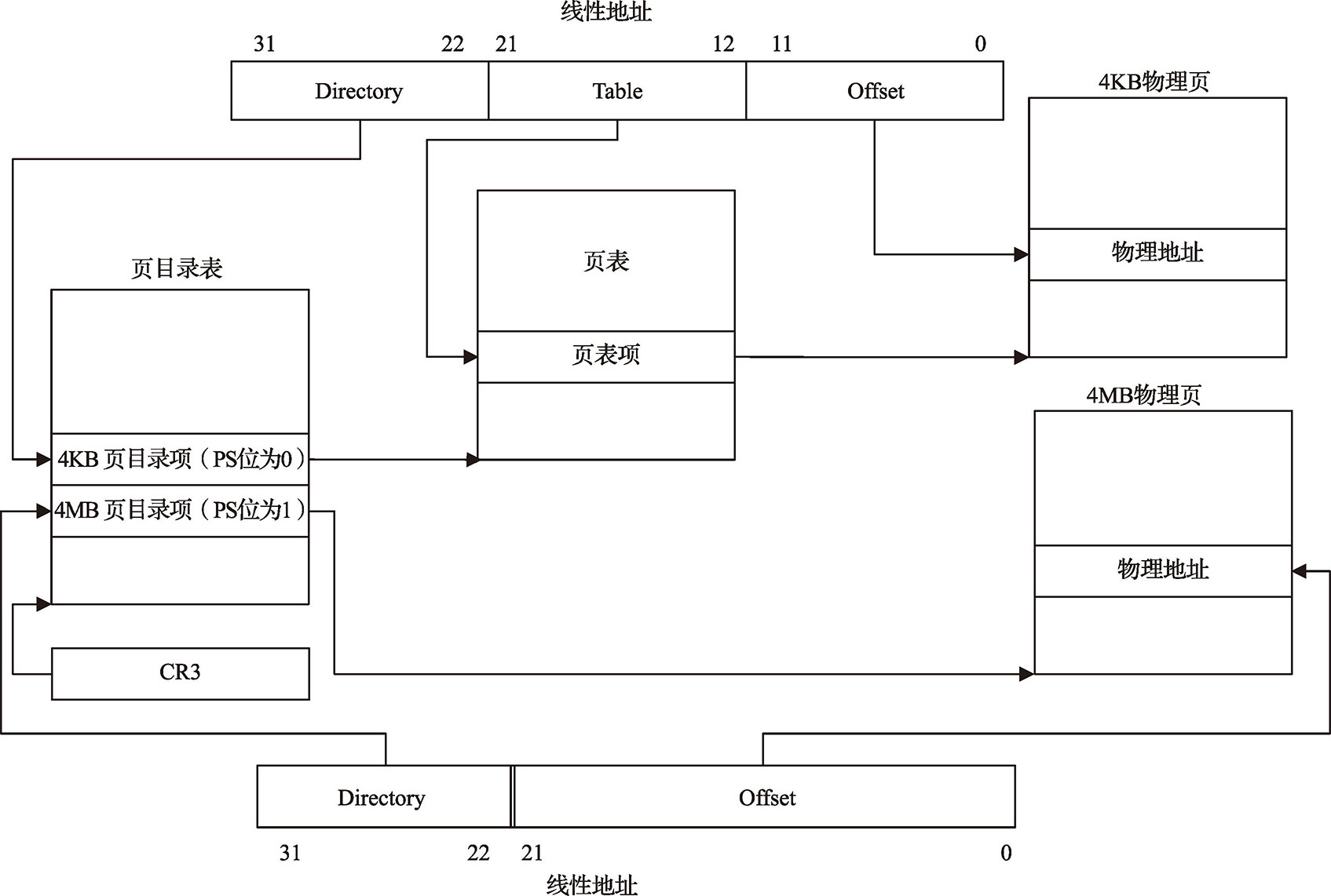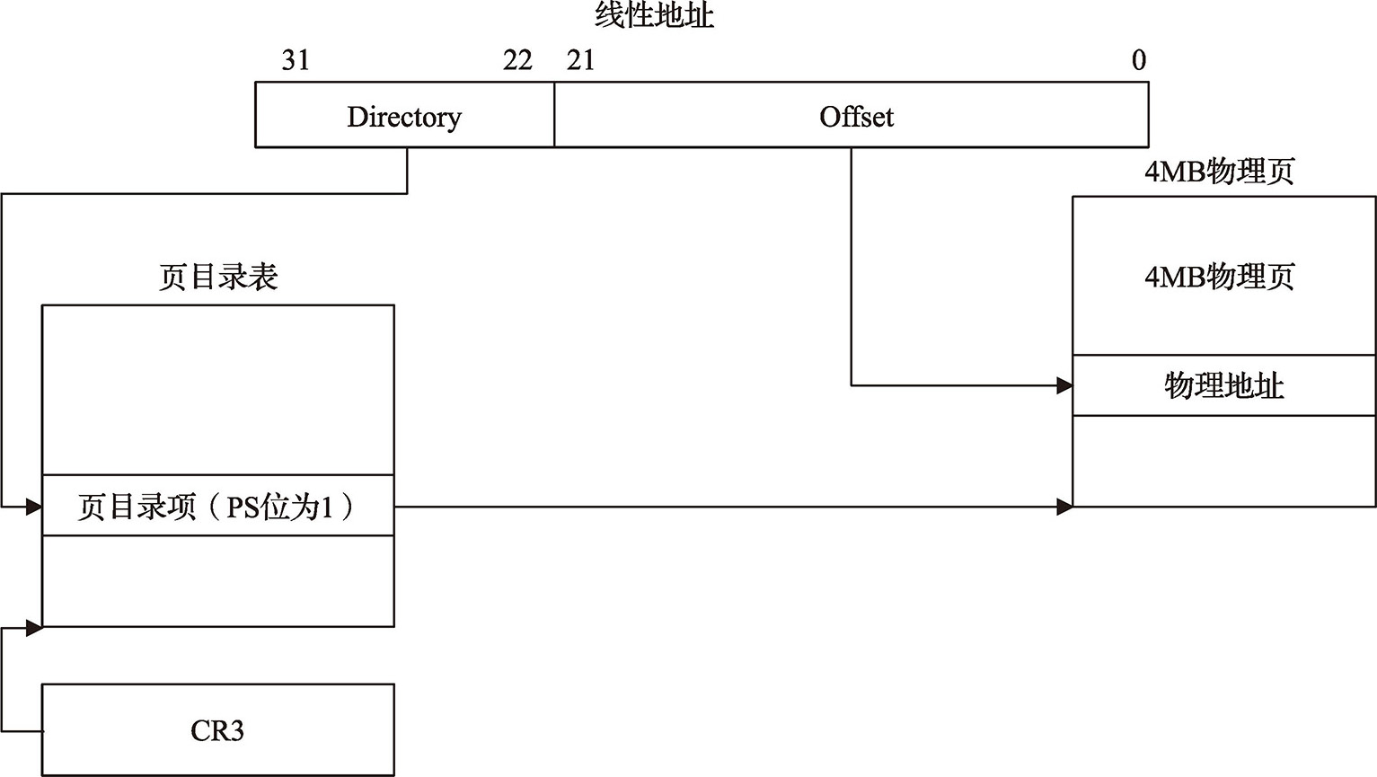 从X86 Pentium处理器开始,Intel引入了PSE(Page Size Extension,页面大小扩展)机制。启动PSE机制后,页目录项的PS位为1时,页的大小就成了4MB,而页表就不再使用了。这时线性地址中的低22位就全部用作4MB物理页中的偏移。这样,总的寻址能力还是没有改变,即1024×4MB = 4GB,但是映射的过程减少了一个层次,如图3-7所示。