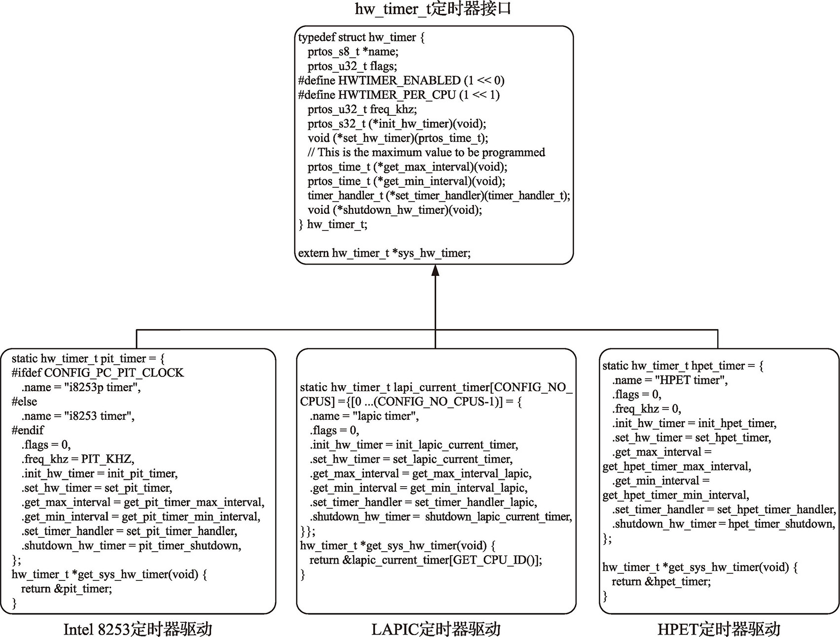 PRTOS使用定时器驱动数据结构hw_timer_t来管理硬件定时器,具体定义请参考源码core/include/ktimer.h。硬件定时器资源属于Per-CPU资源。不管是单处理器硬件平台还是多处理器硬件平台,硬件定时器和pCPU都是一一对应关系,每个pCPU独占一个硬件定时器。PRTOS的hw_timer_t定时器接口基于3种不同的定时器硬件提供了3种类型的定时器驱动,分别是Intel 8253定时器驱动、HPET定时器驱动和LAPIC(Local Advanced Programmable Interrupt Controller,本地高级可编程中断控制器)定时器驱动,如图3-3所示。