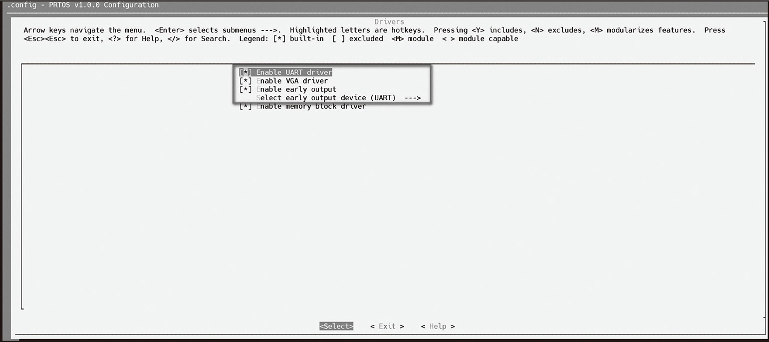 eprintf()在PRTOS初始化的早期使用。当输出设备初始化完成后,我们就可以调用eprintf()实现PRTOS内核状态的输出。在X86硬件平台上,可用的输出设备有UART设备和VGA设备。具体使用哪些设备进行输出,可以在make menuconfig中进行配置,如图3-9所示。