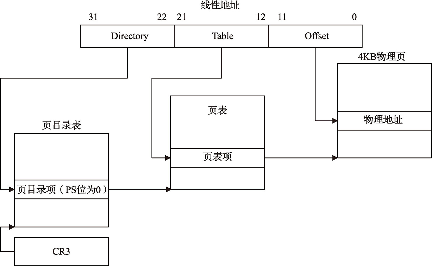 当页式内存映射启用后,以4KB大小的页为例,对32位的线性地址做进一步的地址映射,如图3-6所示。