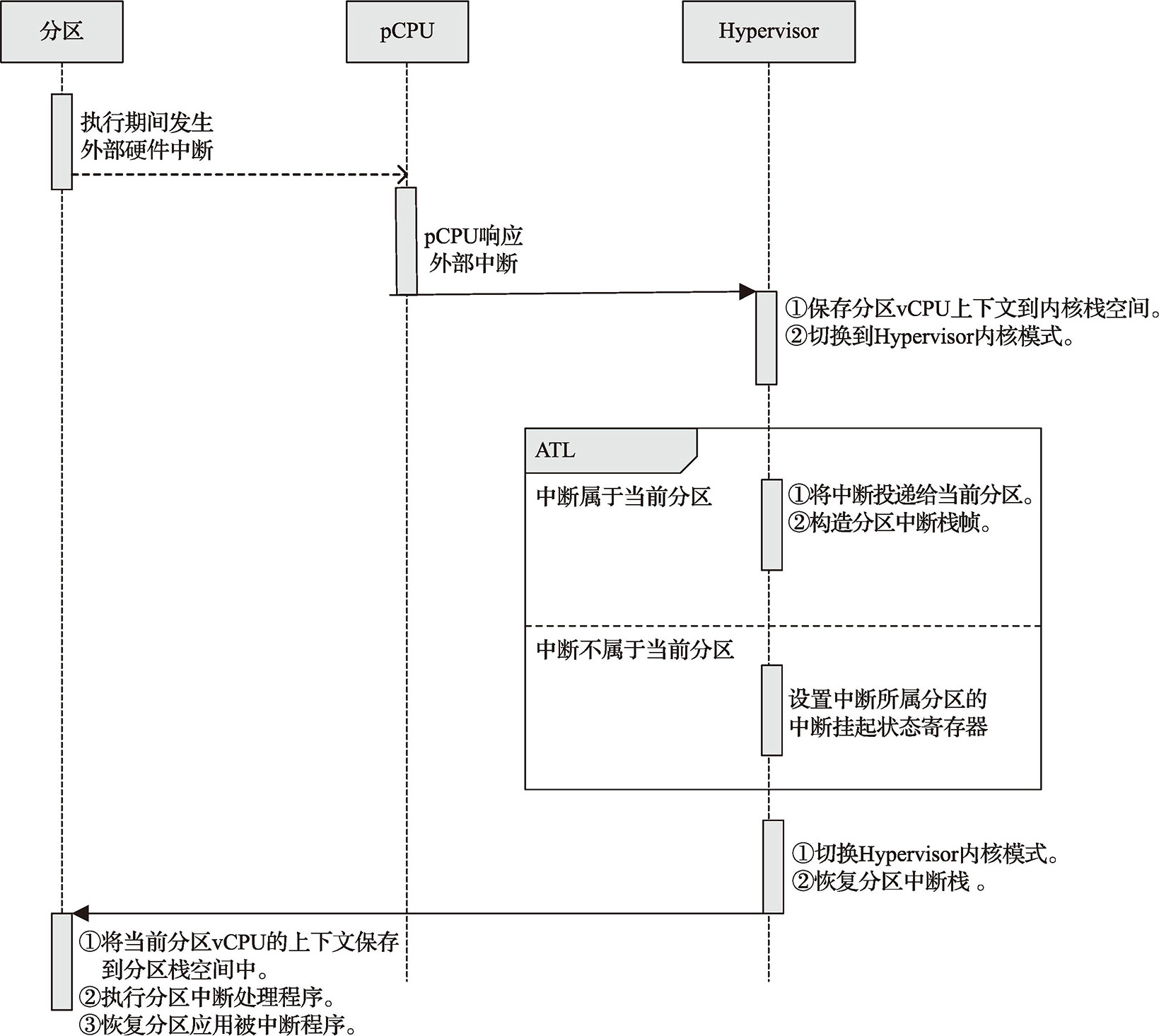 1)中断触发:当一个虚拟机需要响应中断时,PRTOS需要将中断注入到虚拟机中。为此,PRTOS会将物理中断转换为虚拟中断,并将其投递给目标虚拟机。