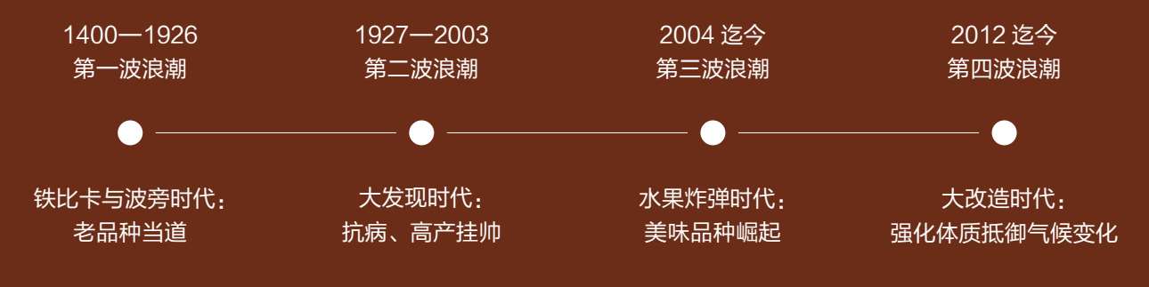 第一章提及阿拉比卡因造物奇迹与美丽误会而诞生,但它从埃塞俄比亚涓滴流入也门的精确年代已不可考,姑且以15世纪咖啡文献中开始大量出现中东地区为起点,600多年来,阿拉比卡为防治病虫害、提高产量、优化风味、因应气候变化的时代需求,经历了四大时期的洗礼与淬炼,