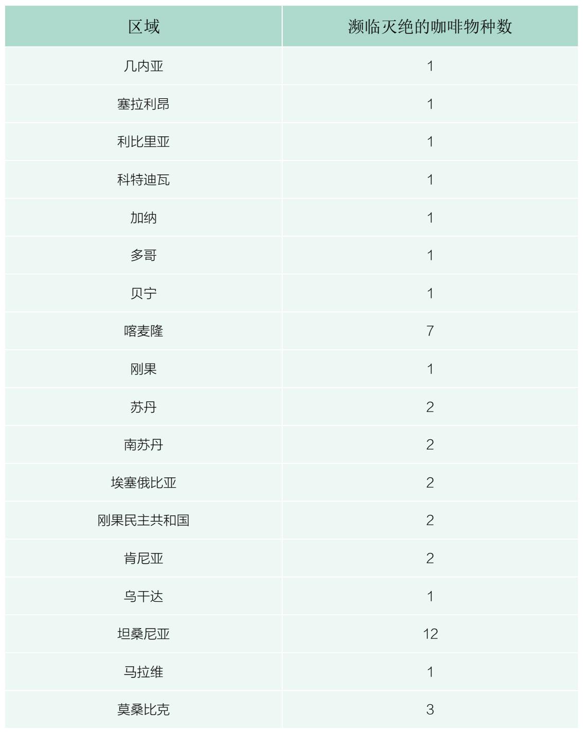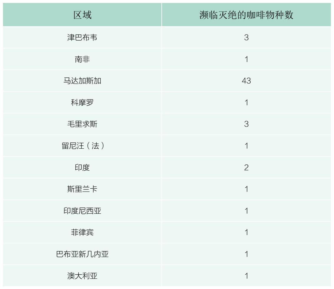 其中,西非有11个咖啡物种濒临绝种,东非有14个,南非有1个,马达加斯加和印度洋岛屿有46个、亚洲有3个(请参见表2-3)。