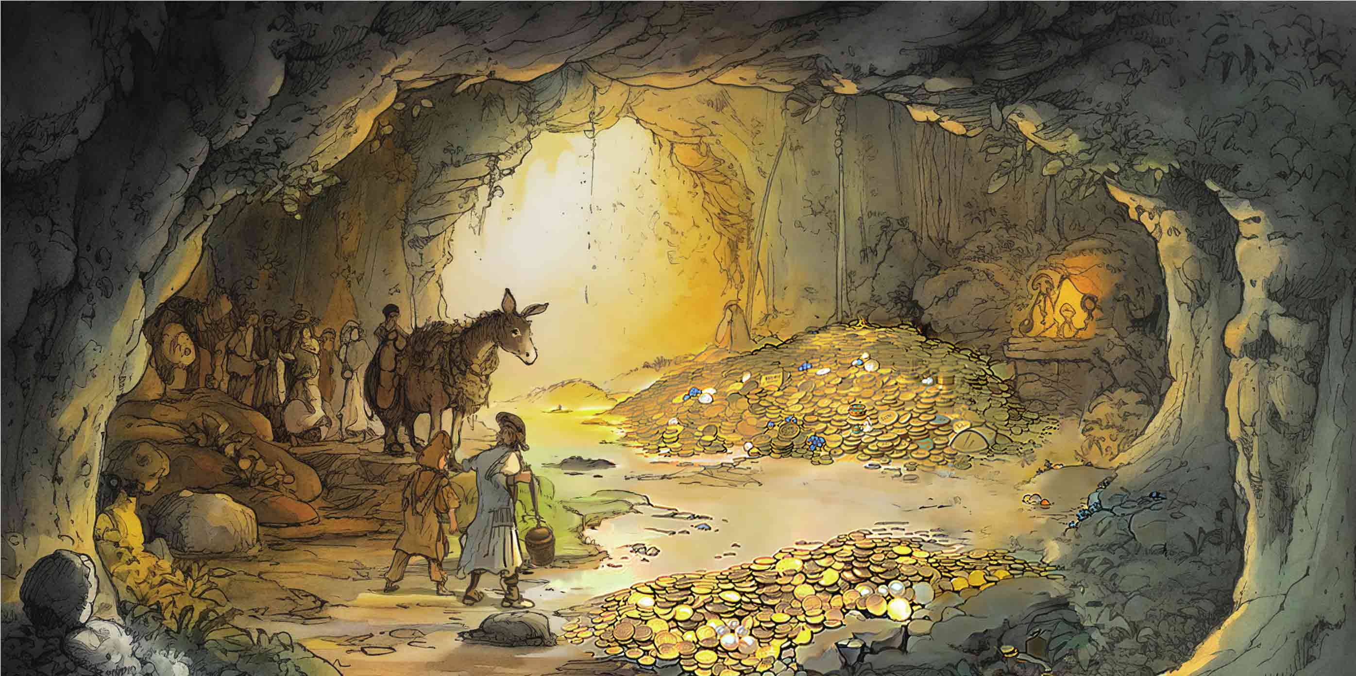 阿里巴巴是个充满好奇心的青年,决定等强盗走后进入那个神秘的山洞一探究竟。