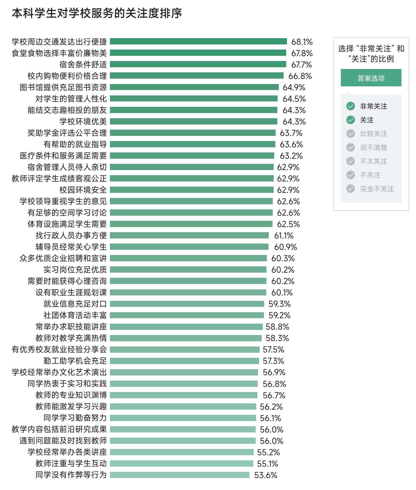 在学生对学校服务的关注程度方面,调查结果显示,大学生对校园生活相关项目关注度较高,其中“学校周边交通发达出行便捷”为今年首次新增项目,便以68.1%关注度位列本科生关注度第一。“食堂食物选择丰富价廉物美”与“宿舍条件舒适”比例相近,以67.8%、67.7%的关注度分别位列第二、第三位,连续三年调查均为本科生关注的焦点。“校内购物便利价格合理”“图书馆提供充足图书资源”分别获得66.8%、64.9%的关注度,位列本科生关注项目前五。此外,学校管理服务也成为学生关注的重点,64.5%的学生在“对学生的管理人性化”项目上表示关注。