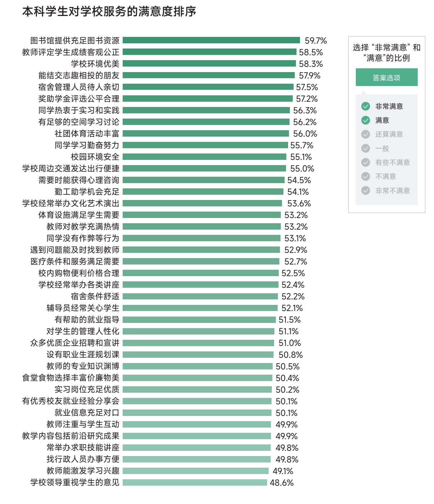 在学生对学校服务的满意程度方面,多数学生在校园生活、学风校风模块下的项目表示满意。“图书馆提供充足图书资源”获得高达59.7%的满意度,连续三年均为满意度最高的项目。“教师评定学生成绩客观公正”“学校环境优美”均斩获58%以上的满意度。而课程教学、后勤服务、就业支持方面的项目,学生的满意度相对较低。在课程教学上,“教师能激发学习兴趣”“教学内容包括前沿研究成果”“教师注重与学生互动”分别获得49.1%、49.9%、49.9%的满意度;在后勤服务上,“学校领导重视学生的意见”仅获得48.6%的满意度,“找行政人员办事方便”获49.8%的满意度;在就业支持上,“常举办求职技能讲座”获得49.8%的满意度,反映出国内高校在教学与管理、以及学生就业支持方面仍有较大进步空间。