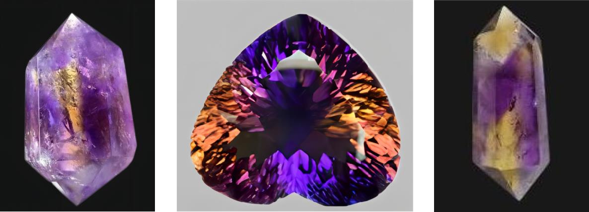 紫黄晶是一种紫色和黄色共存一体的二色水晶,紫色、黄色分别占据晶体的一部分,两种颜色的交界处有着清楚的界限,如图1-2-10。矿物学认为,紫黄晶的紫、黄二色是由于晶体内部的双晶所致,紫色和黄色分别发育于双晶单体中的r面和z面。